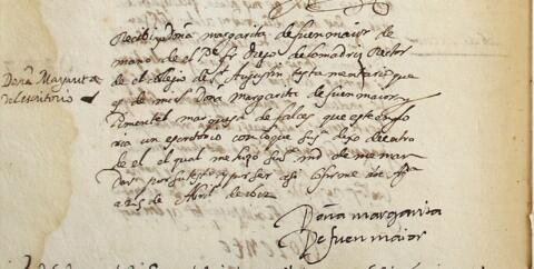 Recibí yo Margarita de Fuenmayor, de mano del padre Fray Diego de La Madrid, rector del Colegio de San Agustín, testamentario que es de mi señora doña Margarita de Fuenmayor y Pimentel, Marquesa de Falces, que esté en gloria, un escritorio con lo que su Sª dejó dentro de él, el cual me hizo su Sª merced de e mandar por su testamento y por ser así lo firmé en Ágreda a 25 de abril de 1612.