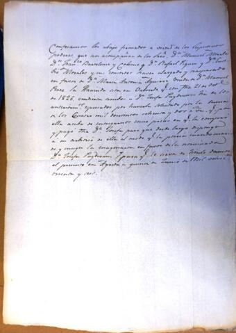 Confesamos los abajo firmados en virtud de los respectivos poderes que nos acompañan los Sres. Manuel Morales, D. Francisco Bartolomé y Colomo, D. Rafael Piquer y D. Eusebio Morales y sus consortes, haber alargado y traspaso en favor de Dª. María Antonia Aguirre, viuda de D. Manuel Pérez, la hacienda sita en Valverde que con fecha 21 de Octubre de 1826, vendieron ambos a Dª. Josefa Puydeban, tía de los anteriormente expresados, por haberla solicitado por la suma de los cuatro mil doscientos ochenta y dos rs. vn. que por ella acaba de entregarnos como precio en que la compró y pagó Dª. Josepha para que desde luego disponga a su arbitrio de ella al modo que la poseía cuando marido y mujer la enajenaron en favor de la nominada de Dª. Josefa Puideban.
