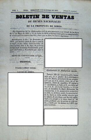Boletín de Ventas de Bienes Nacionales de la Provincia de Soria nº 5 Fecha: 08/10/1862 Hoja/s: 1ª