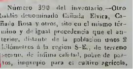 Numero 390 del inventario. — Otro baldío denominado Cañada Elvira, Cañada Rosa y otros, sito en el mismo termino y de igual procedencia que el anterior, distante de la población unos 2 kilómetros a la región S-E, de terreno secano, de ínfima calidad, pobre de pastos, impropio para el cultivo agrícola, que linda N. y O. labores particulares; Sur termino de Fuentes, y E., baldíos de D. Dámaso Abad: mide 19 hectáreas, 31 áreas y 80 centiáreas, equivalentes a 30 fanegas de marco nacional. Se ha fijado en Agreda anuncio para la subasta de esta finca, que ha sido capitalizada por la renta anual de 3 pesetas graduada por los peritos, en 67 pesetas 50 céntimos, deslindada y tasada por el práctico Venancio Ruiz Giménez y el Maestro de Obras D. Zacarías Benito Rodriguez, en 75 pesetas, tipo.