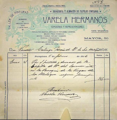 Por el pintado de 60 ms. Cuadrados de la parte alta de la Capilla de Nuestra Señora de Carmen, más la barandilla del púlpito y un pasillo que pasa de dicha Capilla a la del Sagrado Corazón, más la parte baja del altar al óleo, importe 120 ptas.
